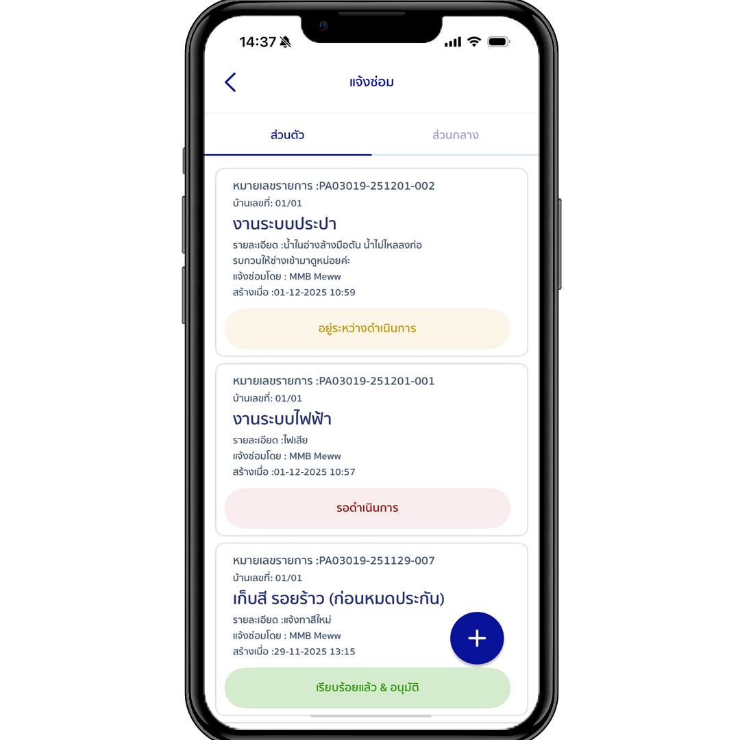 ผู้พักอาศัยสามารถแจ้งซ่อมบำรุงสิ่งอำนวยความสะดวกทั้งของส่วนตัวและสาธารณะ ให้แก่นิติบุคคล