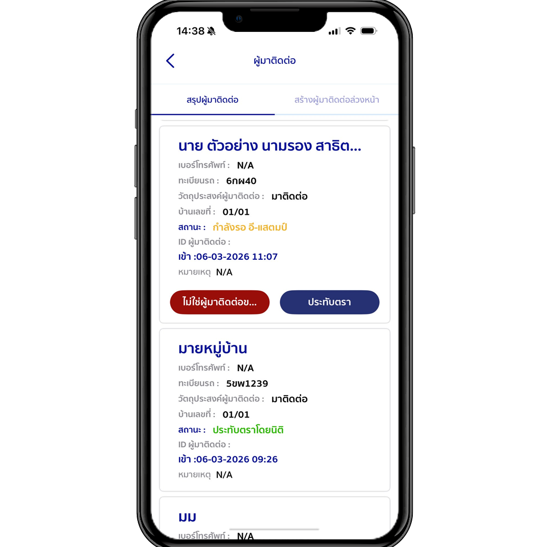 ผู้พักอาศัยหรือลูกบ้าน สามารถรับการแจ้งเตือนของผู้ที่มาติดต่อ สามารถประทับตราอิเล็กทรอนิค และยังสามารถจองการเข้ามาติดต่อล่วงหน้าให้กับคนรู้จัก